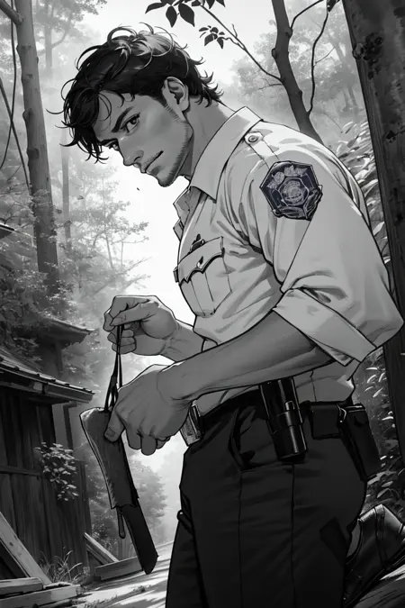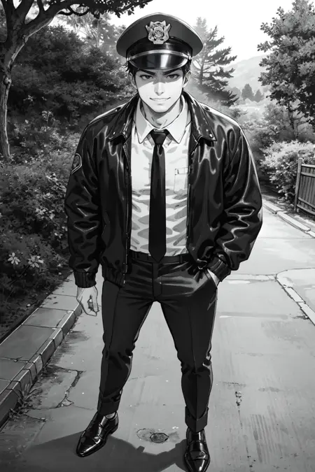 Prompt: black hair, short hair, thin stubble, black eyes, policeman, white collared shirt, dark blue necktie, black jacket, long sleeves, black sleeves, (buttoned up jacket), dark blue pants, black shoes, police peaked cap, greyscale, monochrome, (manga brushwork style, traditional drawing)