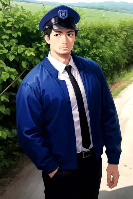Negative Prompt bracelet, sweatdrop, holding, cellphone, cigarette, military hat, short necktie, white pants, black shirt, blue shirt, oversize jacket, (bag, suitcase)