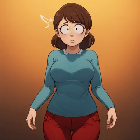 1girl, solo, Liane Cartman, brown hair, shirt, long sleeves, blue shirt, mature female, red pants,