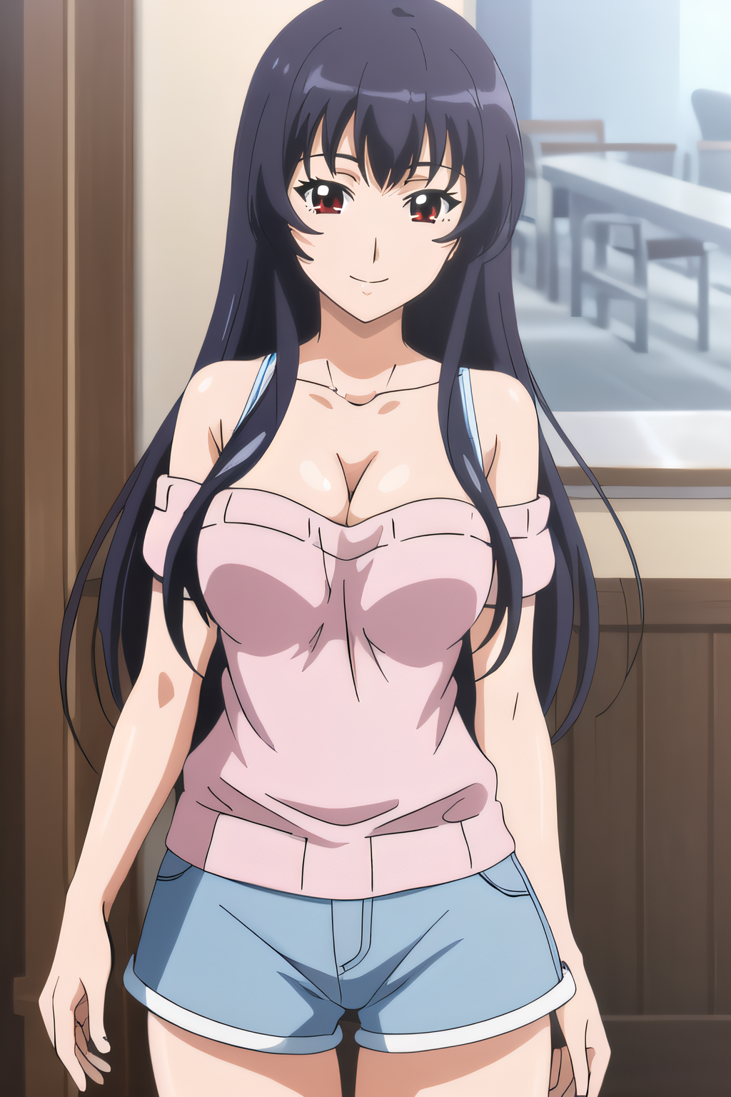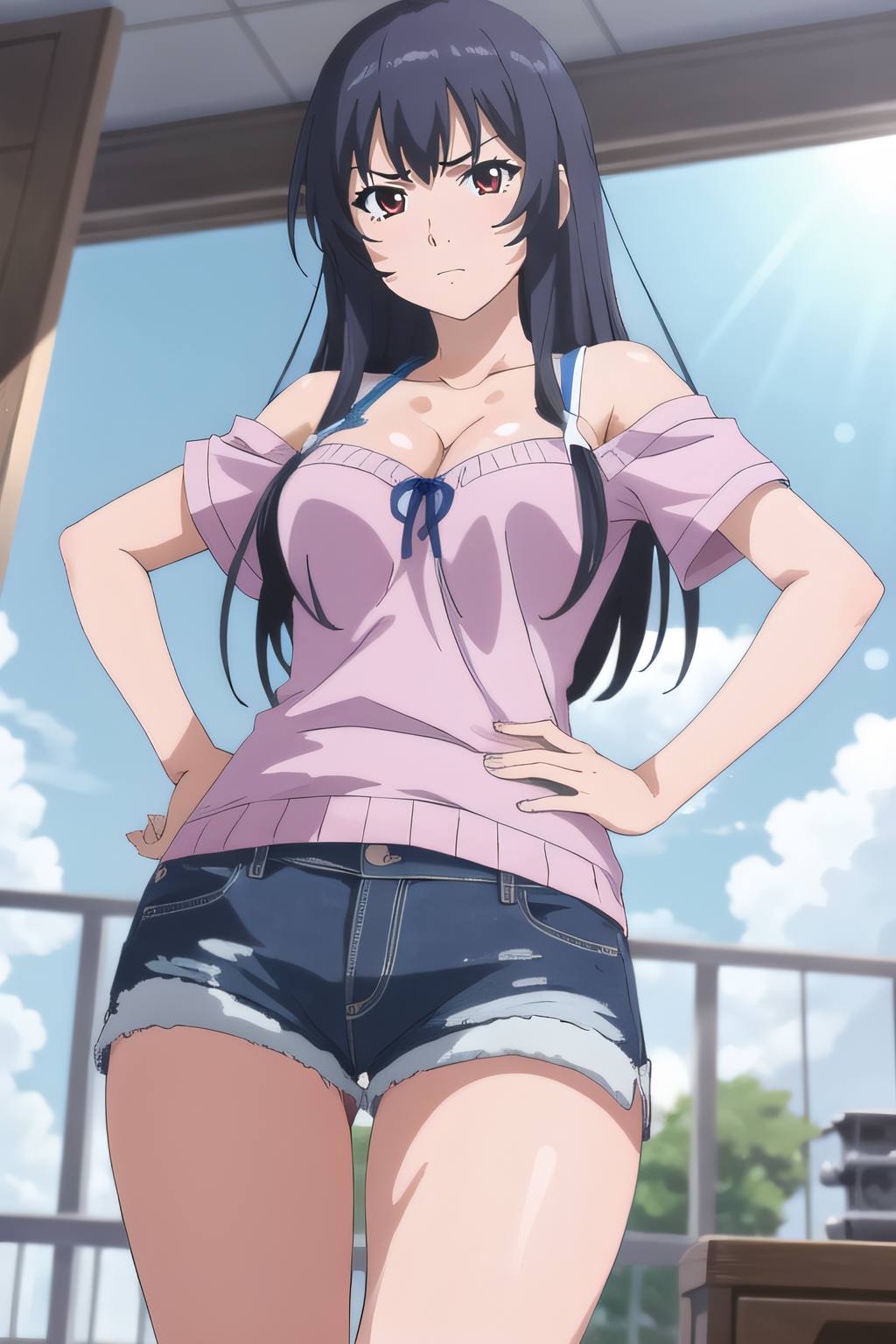long hair, cleavage, bare shoulders, pink sweater, short sleeves, (blue shorts:1.4, shorts)