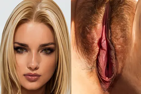 The concept is a woman's portrait - full face view with a side-to-side view of her vulva.