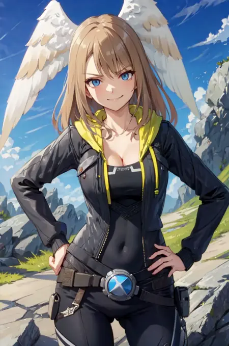 没怎么成功让连帽衫呈现正确的颜色,但其他部分效果正常。服装的权重设为 0.7,如需生成不同的服装,请相应降低权重。