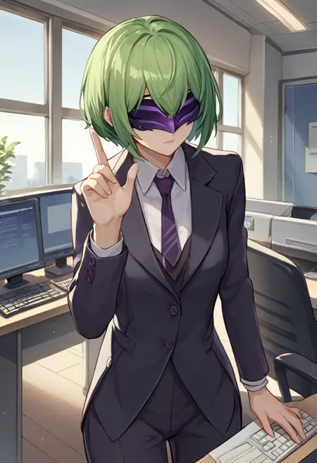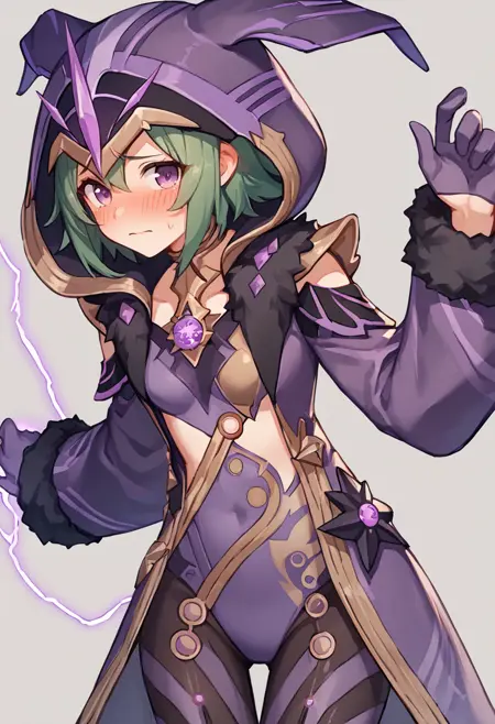 electrocicin, green hair, short hair, eye mask, covered eyes, hood, hooded cloak, purple leotard, fur trim, long sleeves, gloves