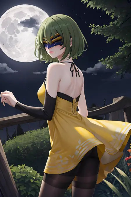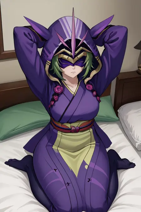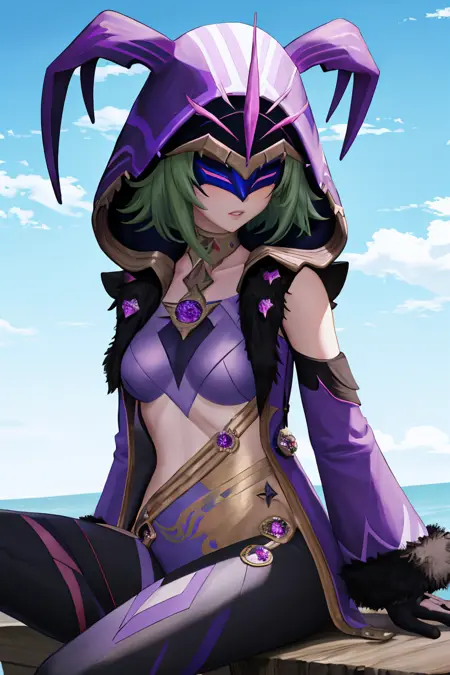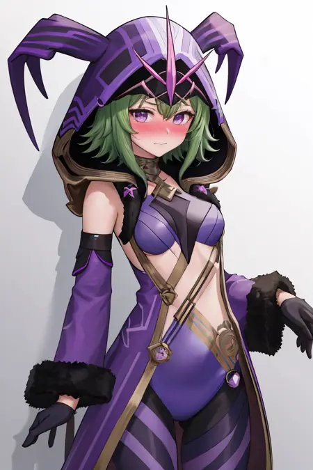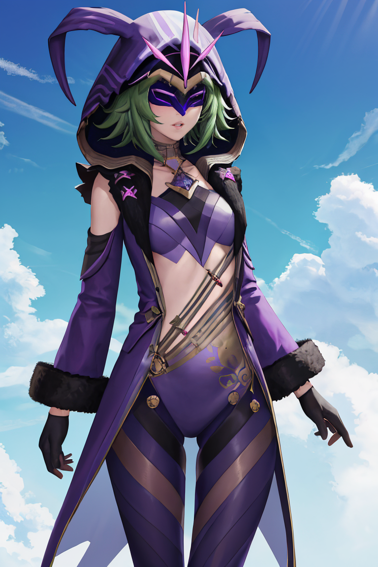 electrocicin, green hair, short hair, eye mask, covered eyes, hood, hooded cloak, purple leotard, fur trim, long sleeves, gloves