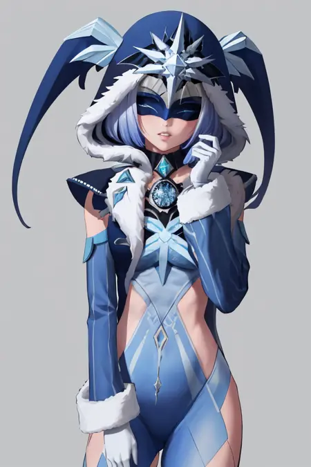 cryocicin,蓝发,眼罩,遮住眼睛,兜帽,披风,蓝色连衣裙,露肩,毛皮镶边,长袖,白色手套,钻石\(宝石\)