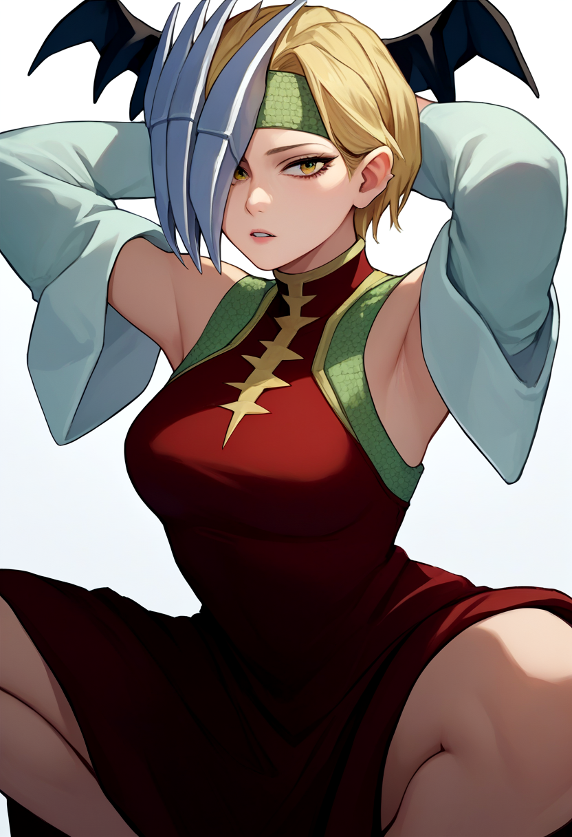 Default Outfit: headband, half mask, head wings, red dress, detached sleeves