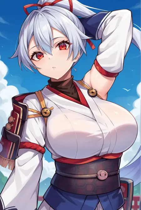 服装1: [默认服装: "tomoe_def_sdxl, 发带, 红色发带, 黑色内衬, 高领, 带子, 腰带, 单肩护甲, 红色手套, 露指手套, 单侧脱落袖子, 白色袖子, 不对称袖子, 不规则袖子, 蓝色袴, 袴"]