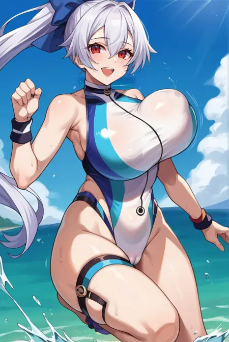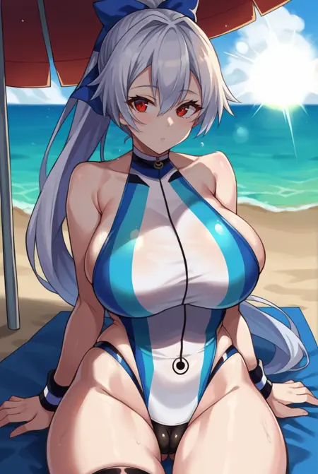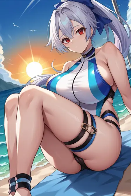 Outfit 2: [swimsuit outfit: "tomoe_swimsuit_sdxl, hair ribbon, blue ribbon, one-piece swimsuit, highleg swimsuit, thigh straps, wristband"]
