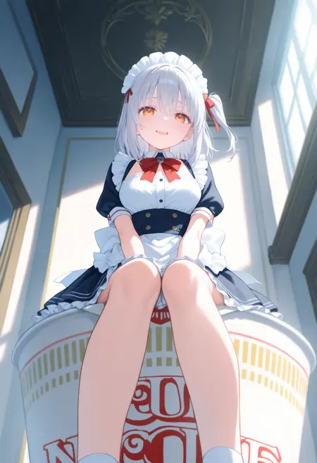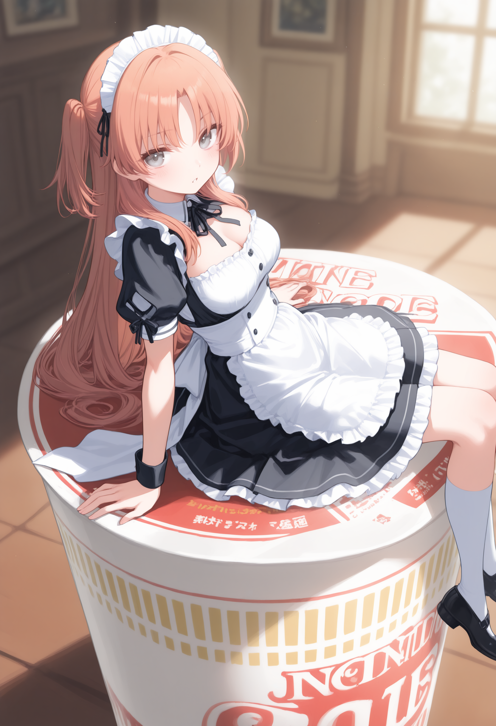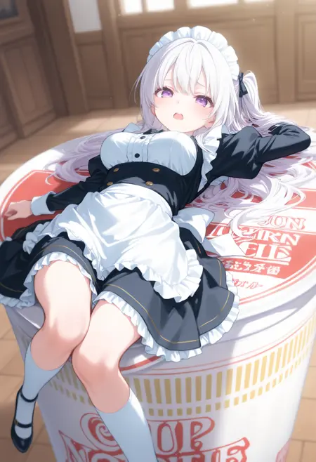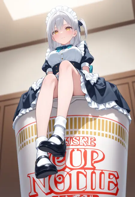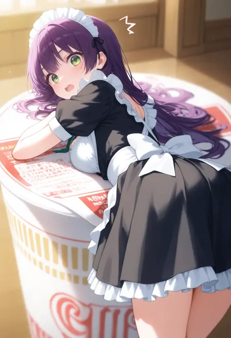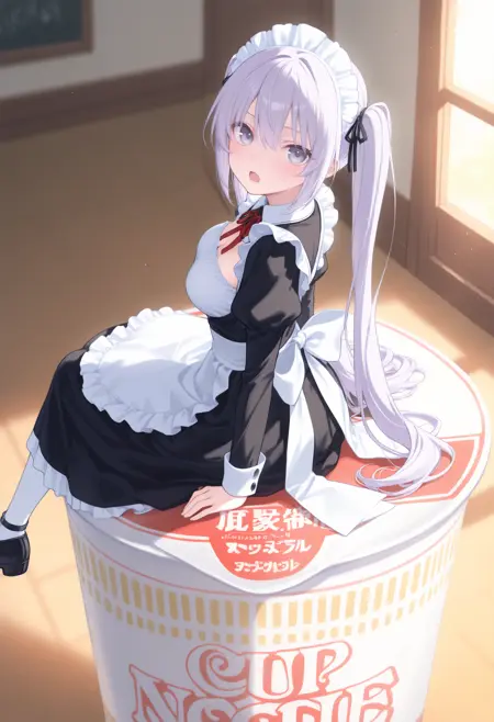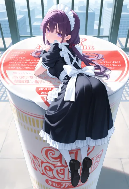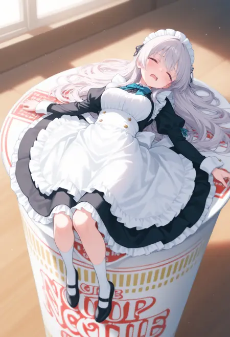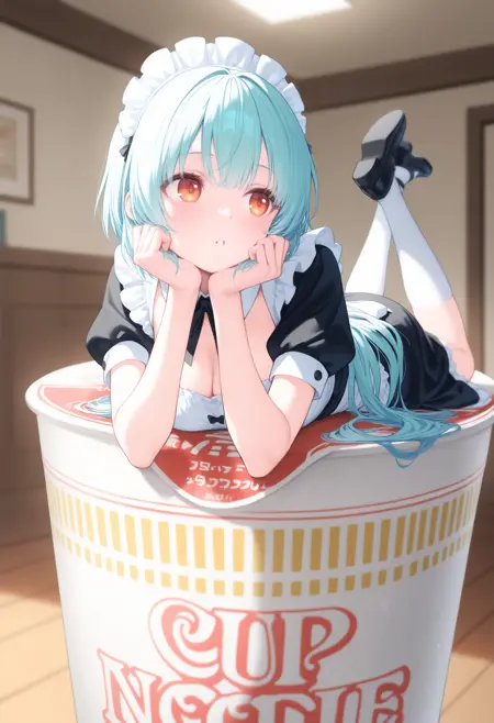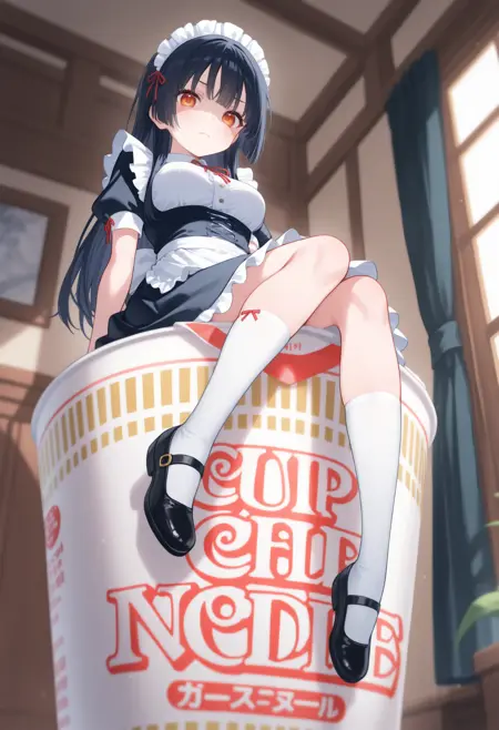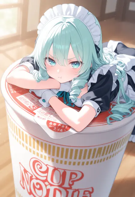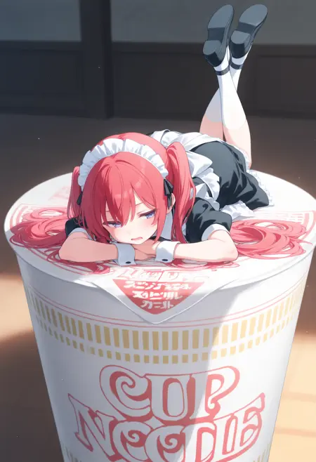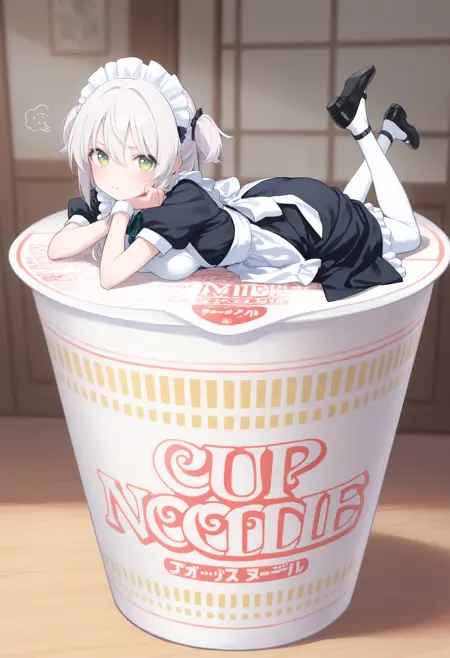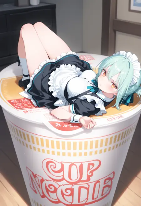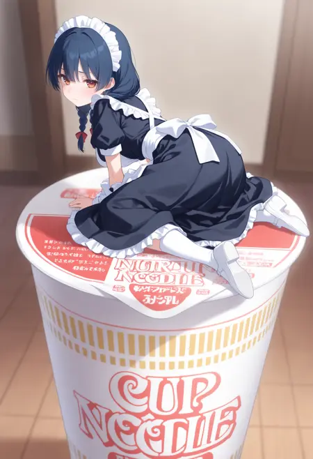 フィギュアのジャンルの一つであるカップラーメンの蓋を押さえる状態のイラストを作成するLoRAです。