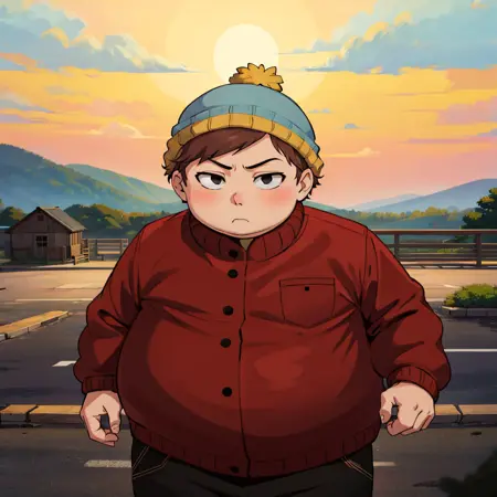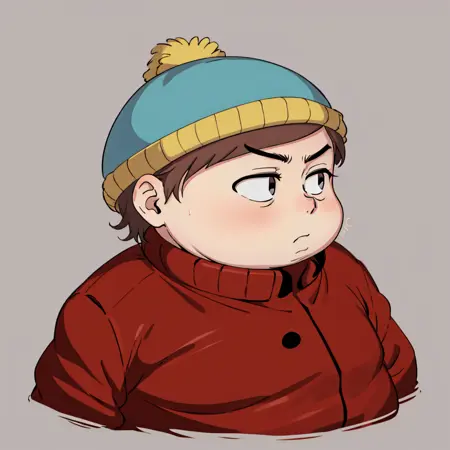 1boy, solo, Eric Cartman, short hair, brown hair, hat, black eyes, closed jacket, red jacket, beanie, fat, child,
