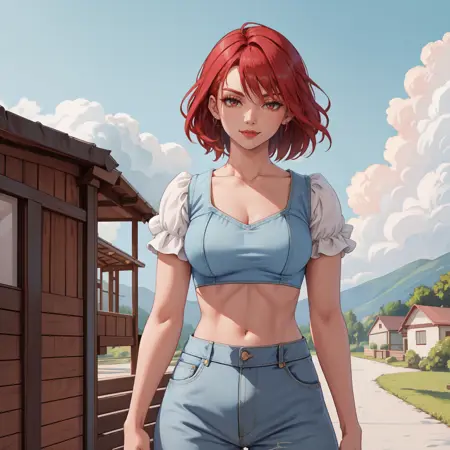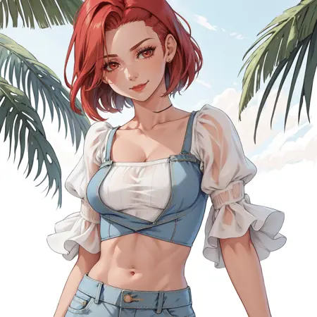 关键词: hud_vacay,珠宝,牛仔裤,白色背心,蓬松袖子,短袖,露脐
