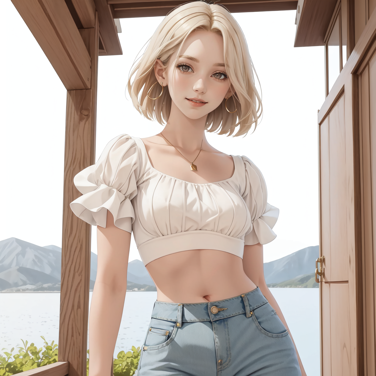 Keywords: hud_vacay, jewelry, denim jeans, white crop top, puffy sleeves, short sleeves, midriff