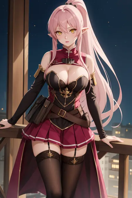 가장 중요한 태그는 "ariane, 노란 눈, 긴 머리, 날카로운 귀, 눈 사이에 있는 머리카락, 측면의 머리카락, 아주 긴 머리카락, 높은 반묶음, 분홍색 머리"입니다.