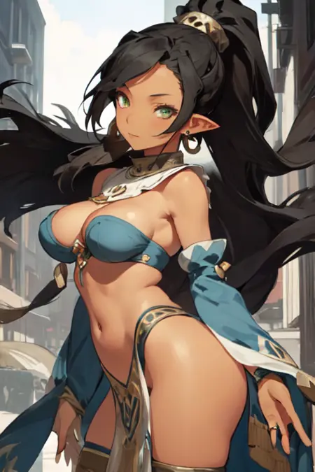 KaliDN, 1girl, solo, long hair, large breasts, black hair, ponytail, navel, jewelry, medium breasts, very long hair, green eyes, earrings, detached sleeves, pointy ears, dark skin, dark-skinned female, loincloth