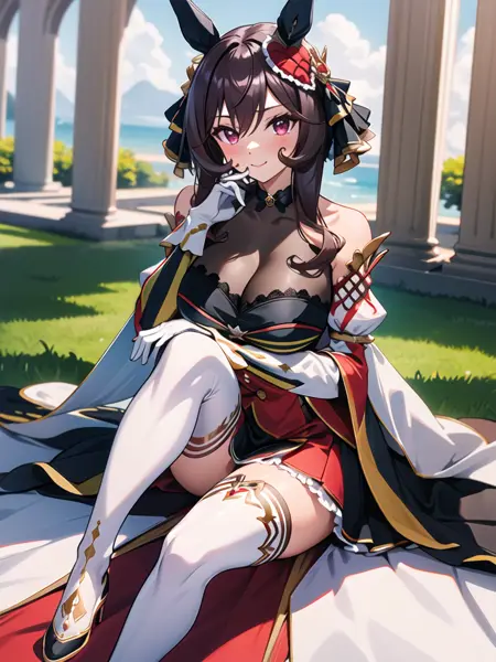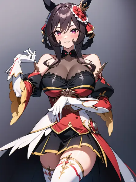 • breasts,large breasts,cleavage,hair ornament,bare shoulders,white legwear,thighhighs,white gloves,elbow gloves,dress,
