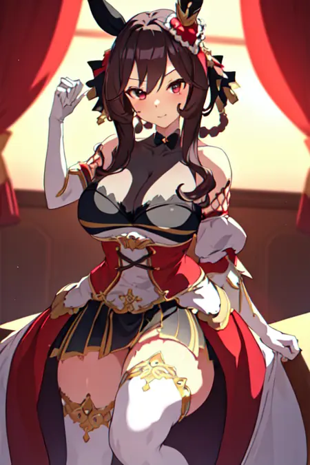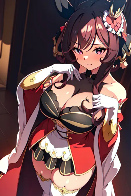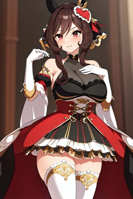 가슴, 큰 가슴, 흉선, 머리장식, 어깨 노출, 흰색 다리옷, 허벅지 긴 양말, 흰 장갑, 팔꿈치 장갑, 드레스