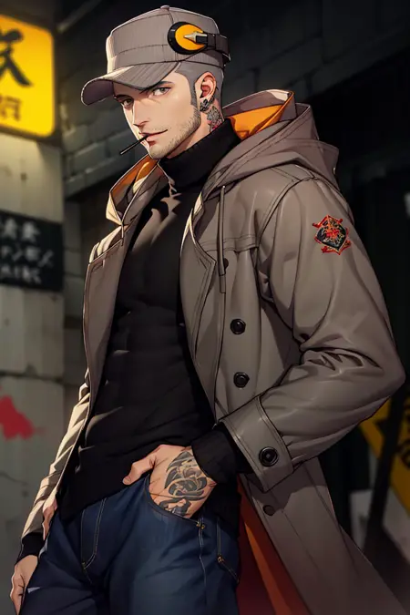 Negative Prompt: (holding), goggles, helmet, (beanie, extra brim, casquette, newsboy cap, garrison cap, peaked cap), (drawstring, belt, belt buckle:1.3), extra tattoo, food in mouth, cigarette, barefoot, (yellow clothing, yellow coat), extra jacket, ripped jeans, (badge, logo)
