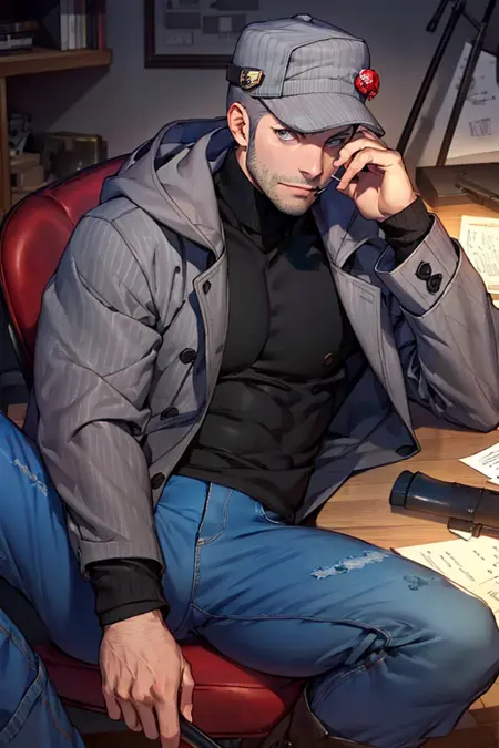 キャラクターmuscularhandsomeasianpersonashin megami tenseimuscular malemasculinepersona 5yaoihatgame characterjapanesemalemanshort hairasian manyakuzatattoojeansbootscharactersturtleneckcoatcapmature malebuzzcutgrey hairhunkgray eyesmale charactermuscular manstubblesgangstagrey_eyesmunehisa iwaijapanese man