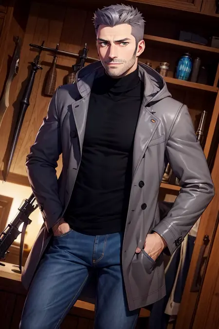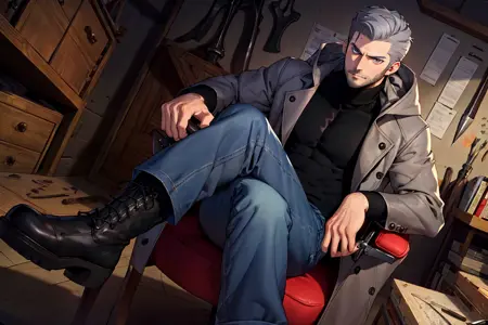 Prompt: grey hair, short hair, stubble, grey eyes, sideburns, (grey pin-striped cap:1.2), yellow ear defenders, black turtleneck sweater, long gray coat, open coat, coat hood down, simple blue jeans, black leather boots