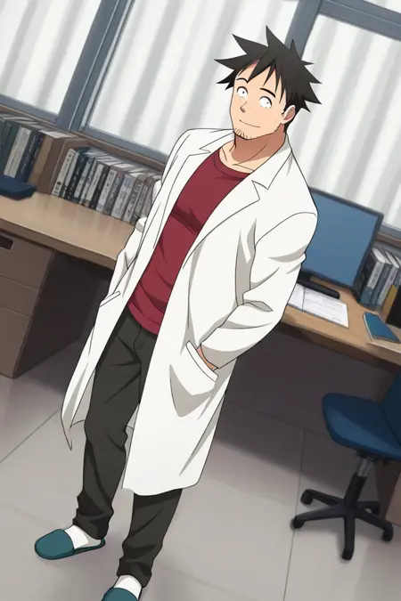 提示:高桥铁男,黑发,刺猬头,鬓角,面部胡须,胡茬,黑眼,三白眼,瞳孔收缩,红色T恤,宽松衬衫,白色实验服,长款实验服,长袖,黑色裤子,黑色鞋子
