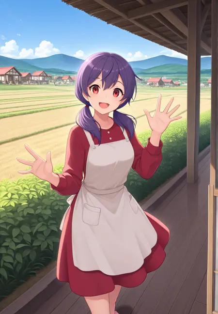 Red's/the player's mother in Pokemon Gen I-III. Prompt is "KantoMom", for her outfit "Dress [or "Red Dress"], Apron, Twintails".