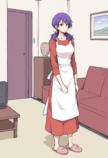 Red's/the player's mother in Pokemon Gen I-III. Prompt is "KantoMom", for her outfit "Dress [or "Red Dress"], Apron, Twintails".