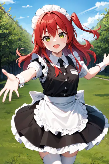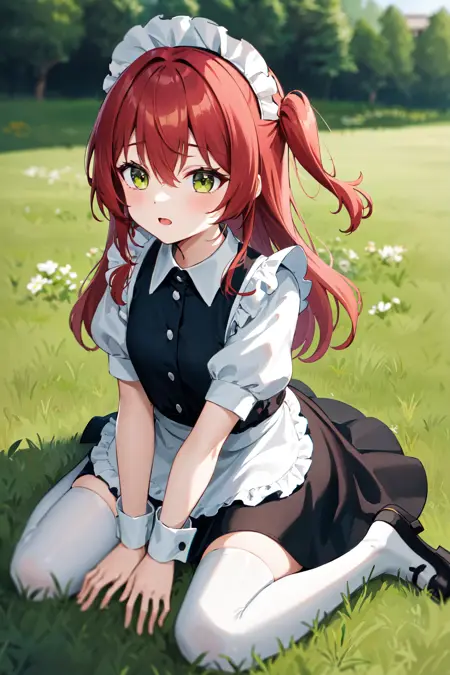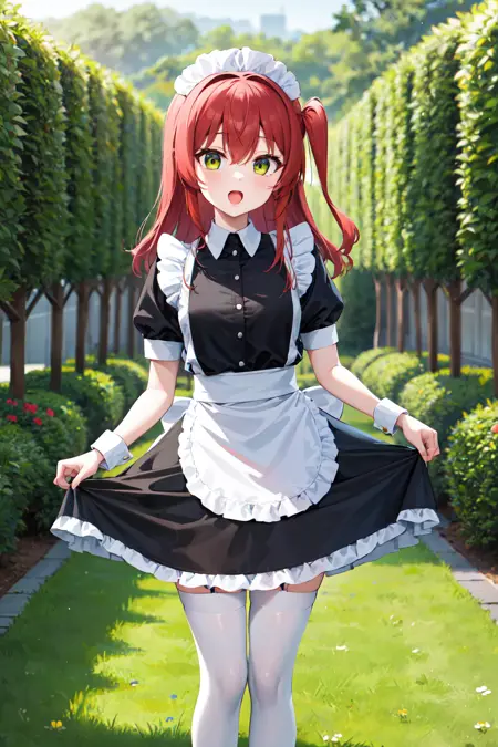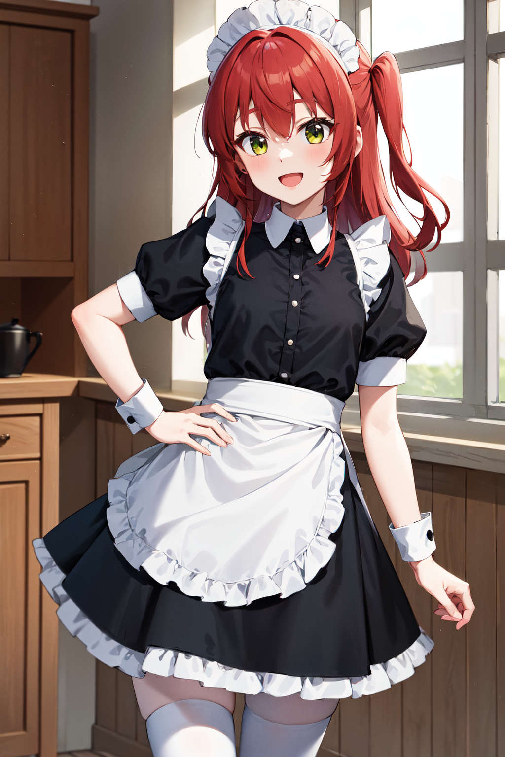 아우트핏2aaikuyo, 긴 머리, 한쪽만 올린 스타일, 메이드 헤드기어, 메이드, 프릴, 검은 드레스, 짧은 소매, 풍선 소매, 손목 커프스, 메이드 앞치마, 흰색 앞치마, 흰색 허벅지 양말