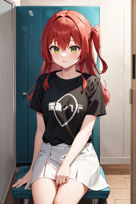 아우트핏3aaikuyo, 긴 머리, 한쪽만 올린 스타일, 티셔츠, 검은 셔츠, 옷에 쓰인 글자, 짧은 소매, 흰 치마