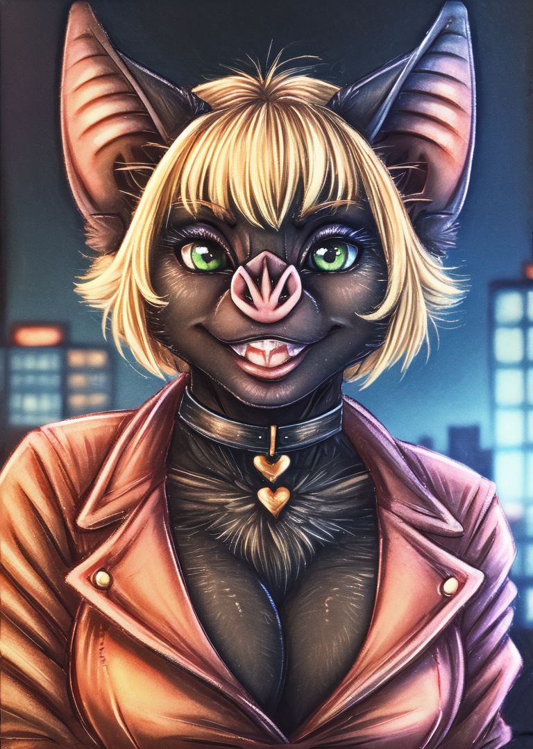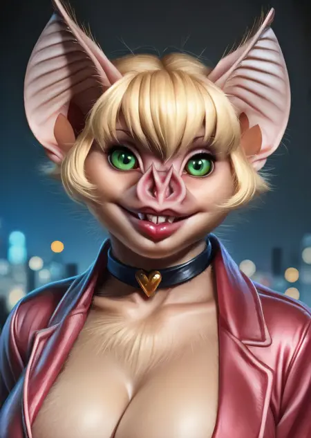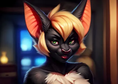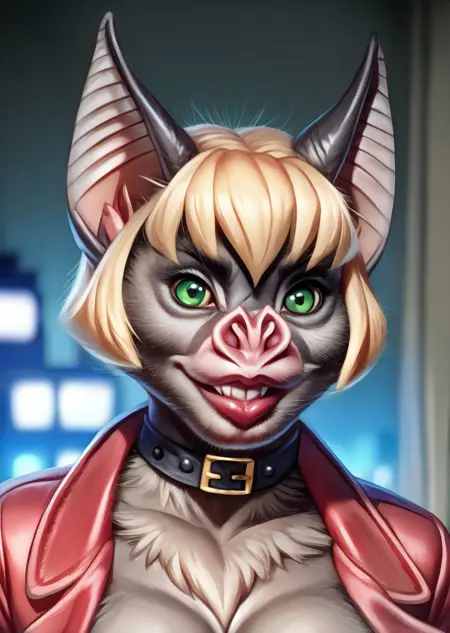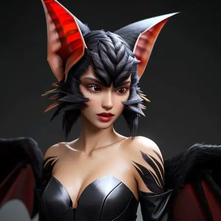 The dataset is quite small and is focused in her half-bat form (she's naked, covered in fur with huge ears and with a boring human face), she will look kinda of wonky because the clothes are mostly in human form (there is a LORA for her human form, i will link here if permitted by author), you can use a LORA to give her a real bat face.