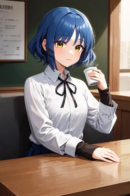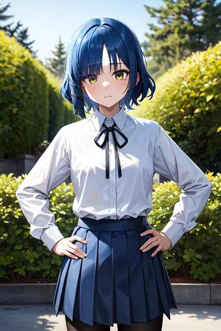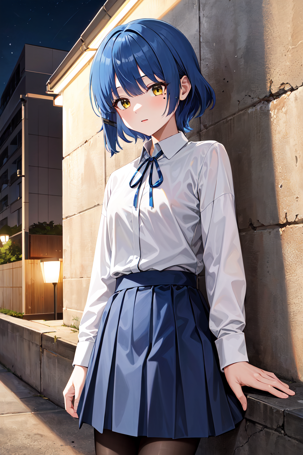 aaryo, short hair, hair ornament, mole under eye, neck ribbon, collared shirt, (white shirt:1.2), long sleeves, pleated skirt, blue skirt, black pantyhose