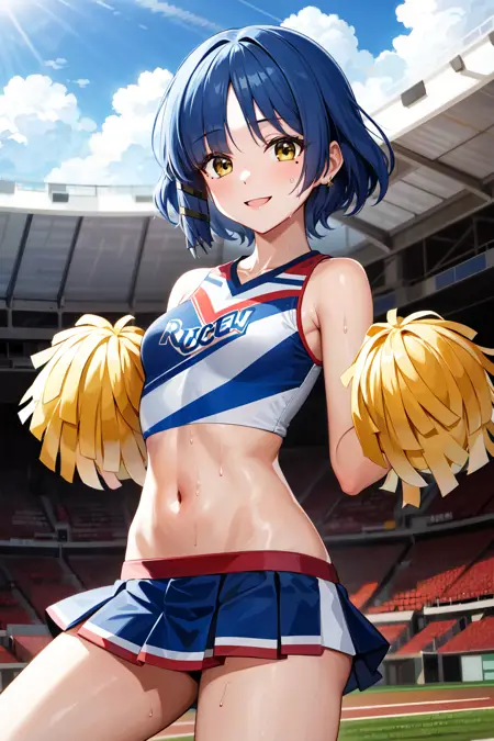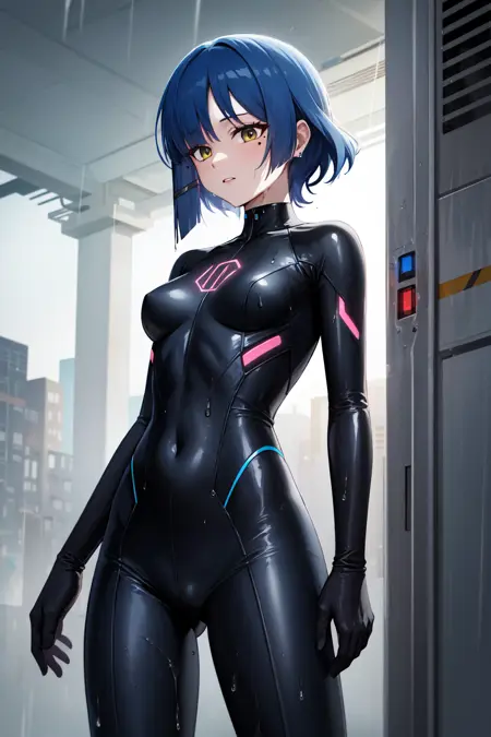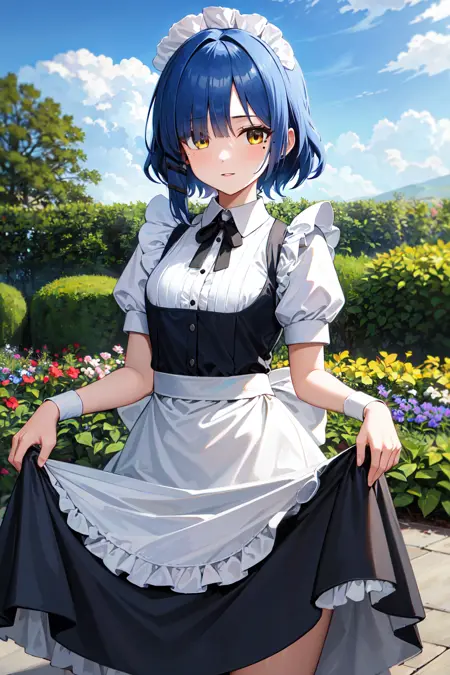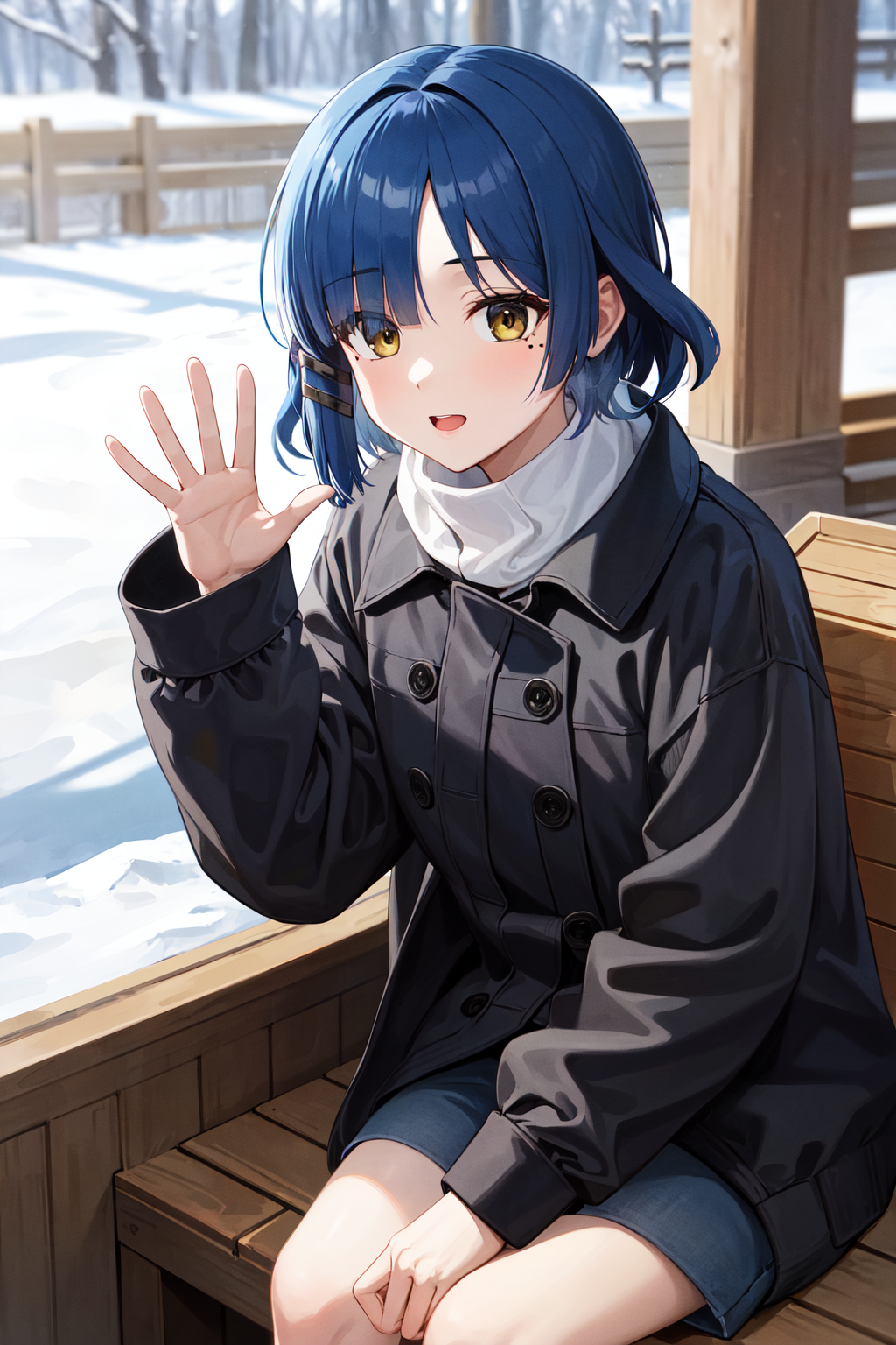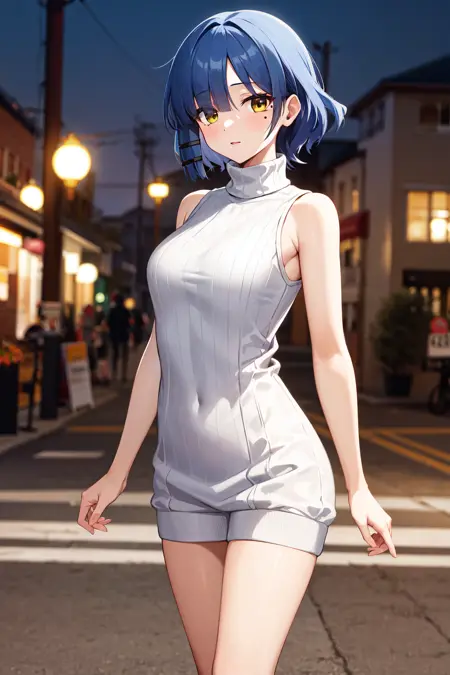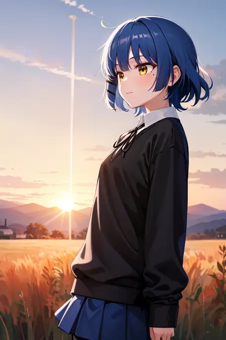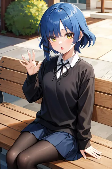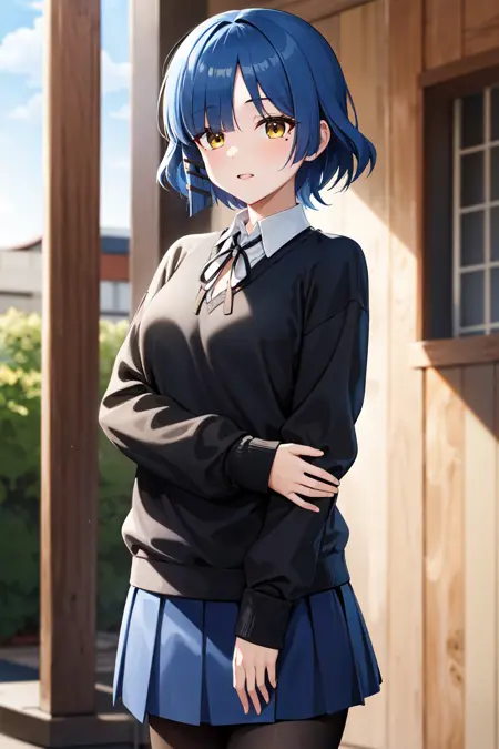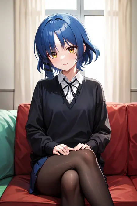 aaryo, short hair, hair ornament, mole under eye, neck ribbon, (black sweater:1.2), long sleeves, pleated skirt, blue skirt, black pantyhose