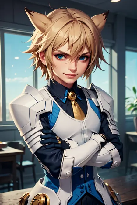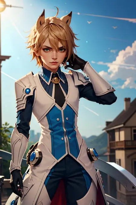 shellingguardian, long hair, blue eyes, blonde hair, brown hair, gloves, 1boy, animal ears, male focus, armor