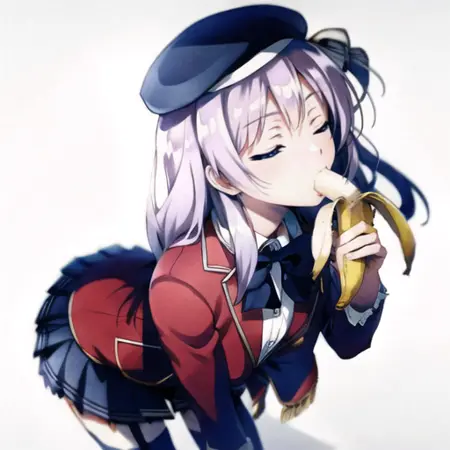 開始タグ: "1girl, sexually suggestive, sucking banana, fruit, banana, holding banana,"