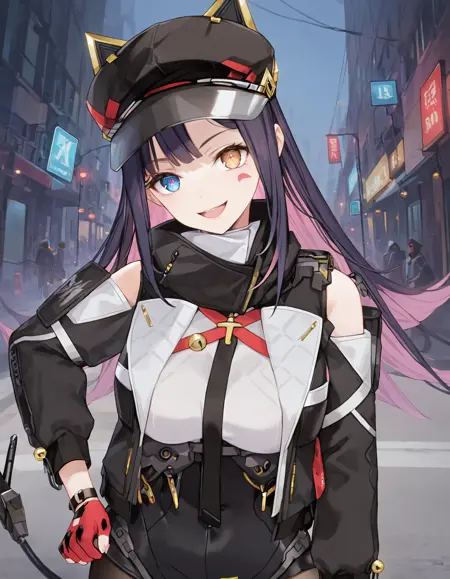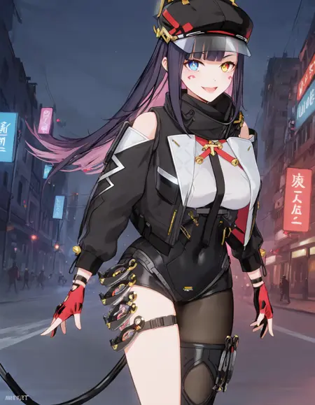 角色强调提示词如下:heterochromia, blue eyes, long hair, black hair, pink hair, multicolored hair, bangs, yellow eyes, mechanical cat tail, single thigh-highs