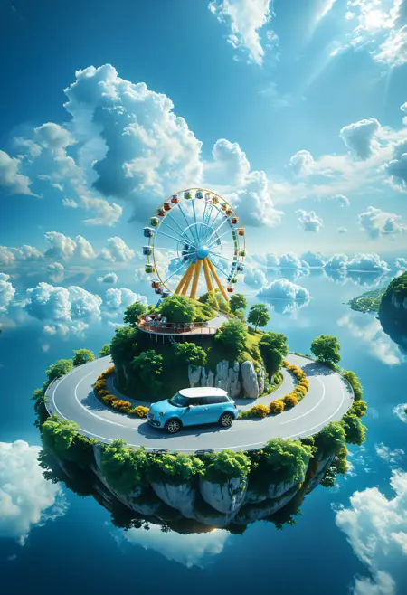触发词:floating island, surreal(若生成的岛屿未漂浮,可提高触发词权重,例如样图中的儿童乐园权重为1.2)