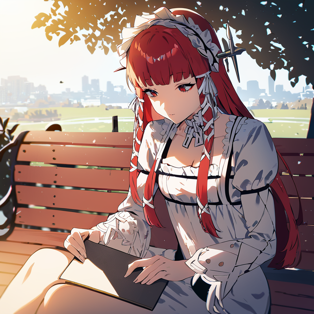1girl, elizabeth (persona), sitting on park bench, persona, soejima shigenori, high quality, masterpiece, newest, latest