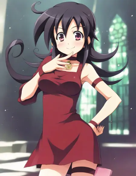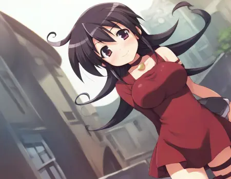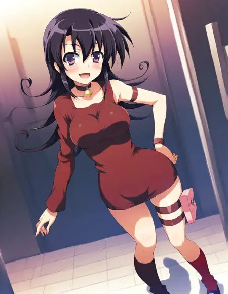 tasogare mimi, red short dress, asymmetrical sleeves,red socks,thigh strap,