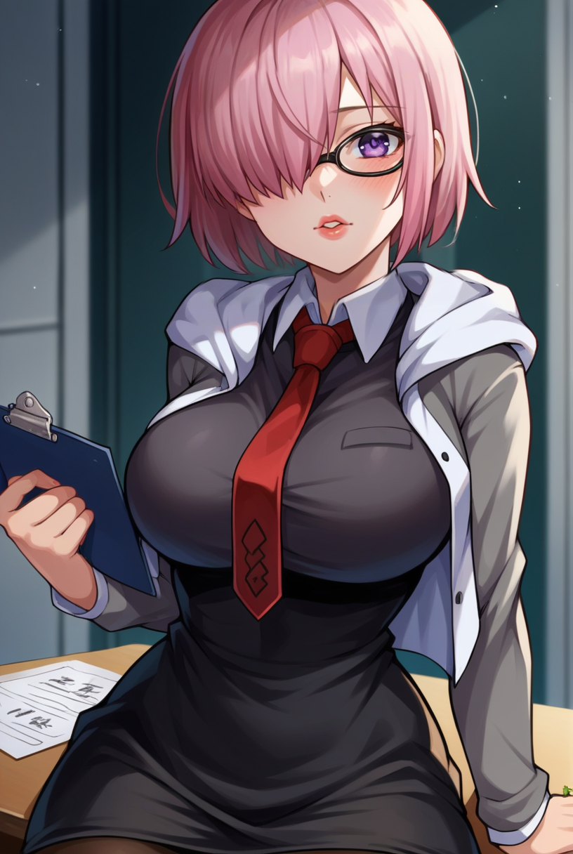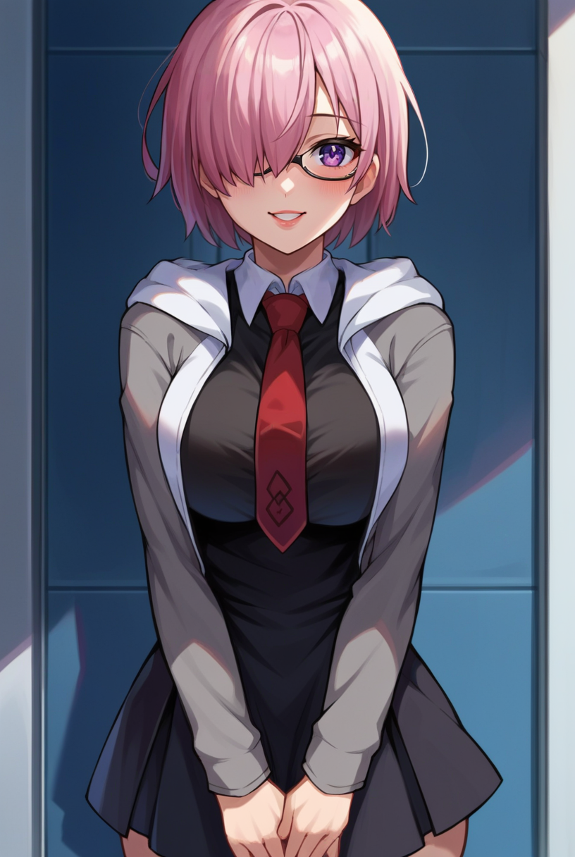 Outfit 1: [**Default: "**Mash_Def, glasses, short dress, black dress, black skirt, necktie, red necktie, wing collar, jacket, open jacket, hooded jacket, grey jacket, hood down, black pantyhose"]