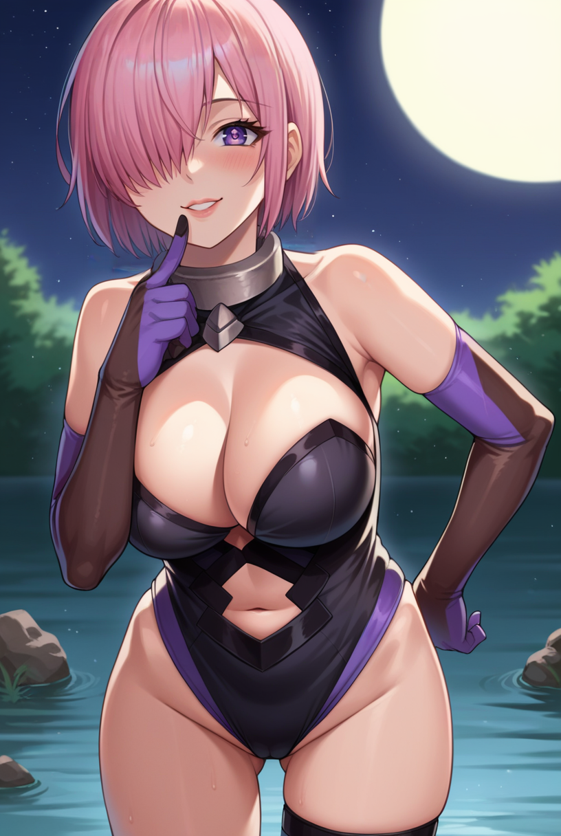 mashielder, purple eyes, pink hair, hair over one eye, short hair, two-tone leotard, two-tone gloves, elbow gloves, two-tone thighhighs, clothing cutout, stomach, navel, single thigh strap, metal collar, highleg leotard, cleavage,