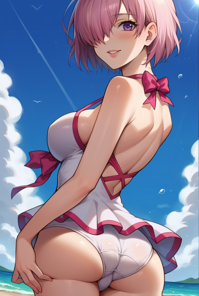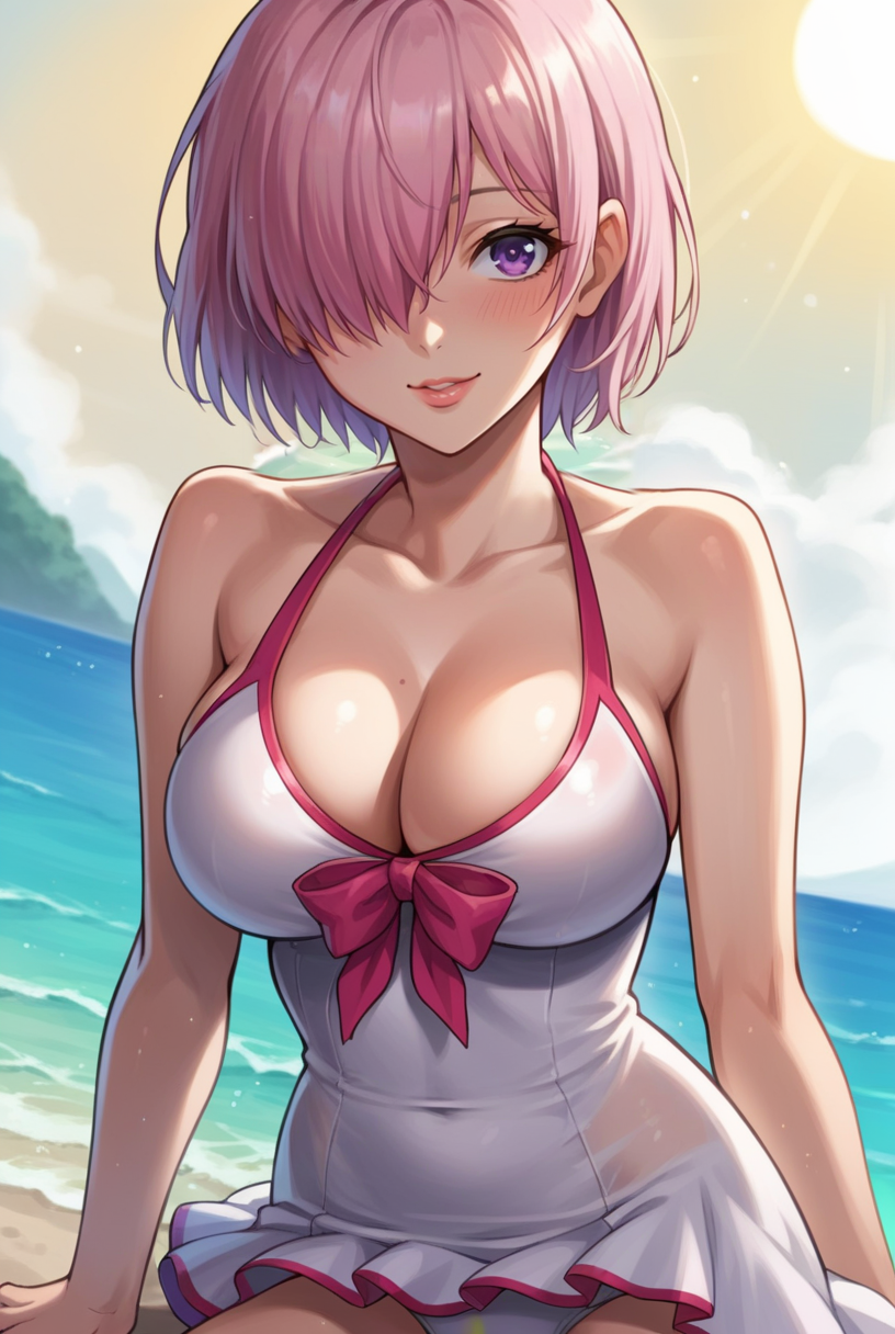 mashswimsuit, purple eyes, pink hair, hair over one eye, short hair, dress swimsuit, white dress,