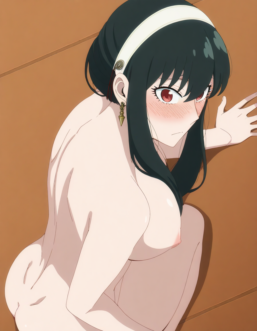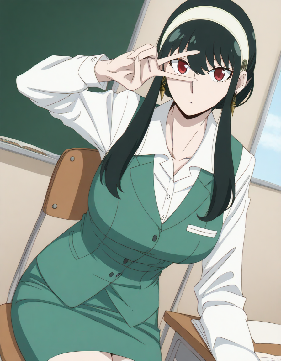 yor briar, black hair, red eyes, earrings, white hairband, hairband, long hair, sidelocks,