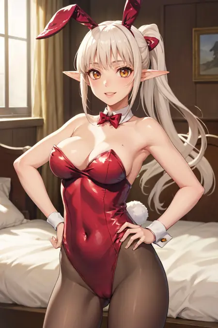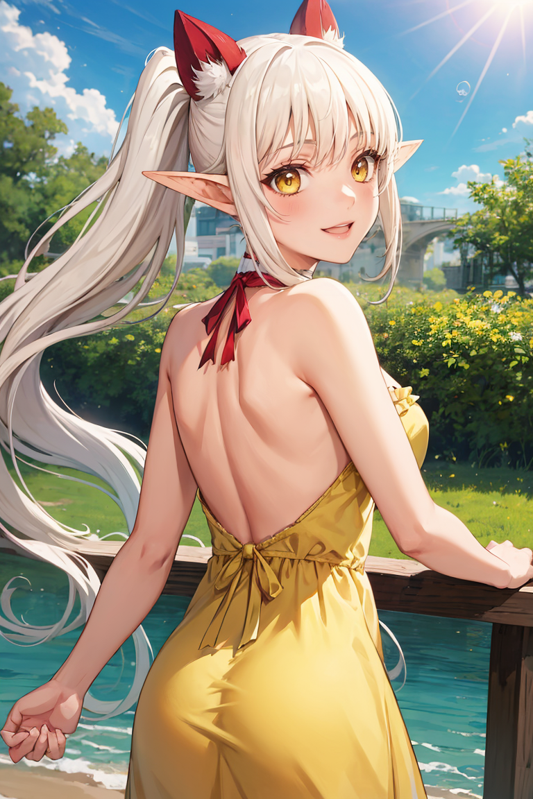 SummonerAldra, ponytail, hair ornament, maid, apron, detached sleeves, panties, white thighhighs