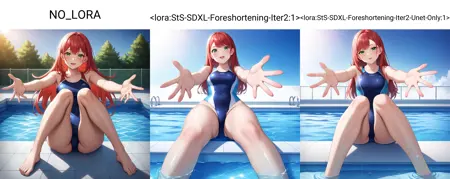 Activation tag for v2.0 LoRas is sts-foreshortening-v2 . Recommended weight 0.6 to 1.0 . Because of the sheer percentage of foreshortening pictures on the internet being foot/feet related, this LyCORIS does foot_focus, feet, and soles rather well. This LyCORIS also does arms_outstreched and reaching_towards_viewer well. This LyCORIS pairs well with my detail slider LoRA for PonyXL.