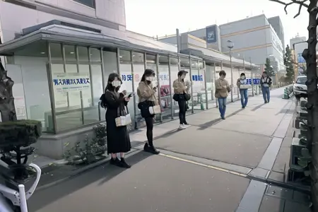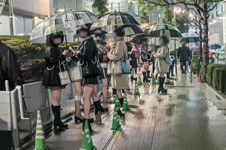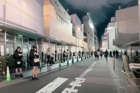 okubobyoin, storefront, 6+boys, street, outdoors, road, multiple boys, real world location, building, scenery, pants, jacket, multiple girls, city, black hair, bag, people, sign, hood, walking, day