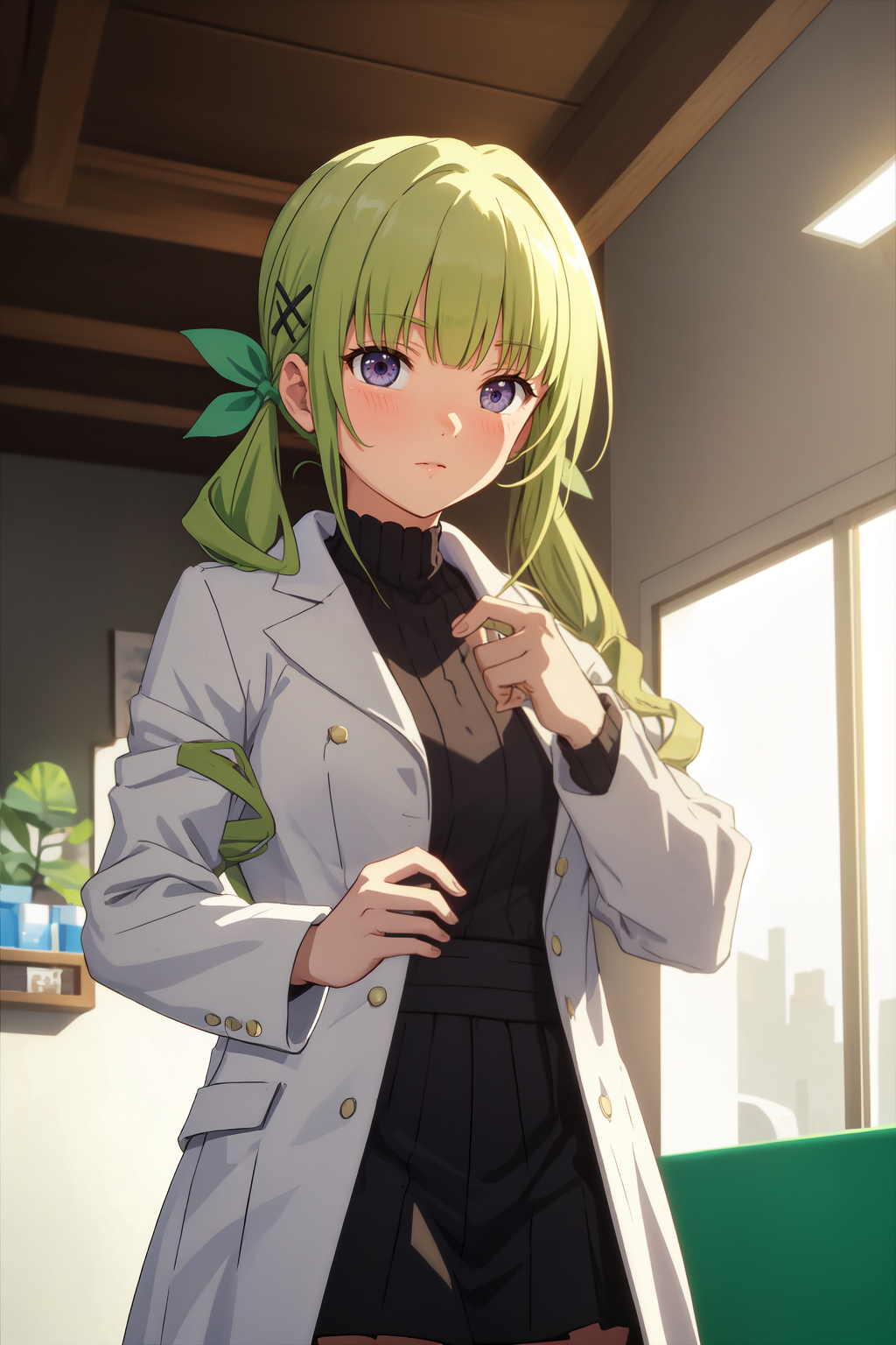 Keine lora:Kanzaki\_Keine:0.7,长发,绿发,(紫色眼睛,低双马尾:1.2),绿色丝带,发带,双马尾,齐刘海,x 发饰