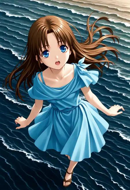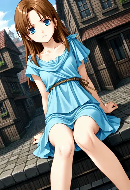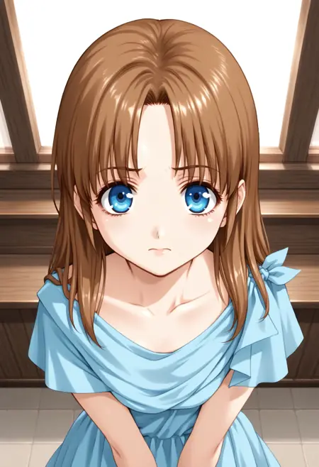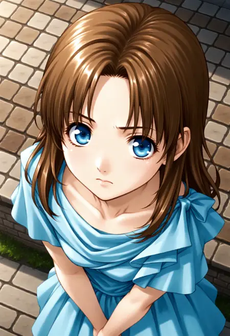 안정적이지 않은 경우, 갈색 머리, 긴 머리, 파란 눈, 파란 드레스를 추가하세요.