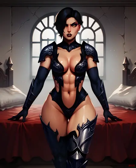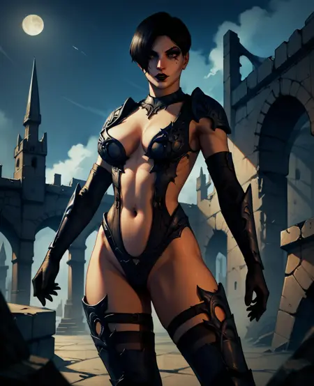 Hero Outfit: navel, cleavage center opening, armor, elbow gloves, thighhighs, boots, heels