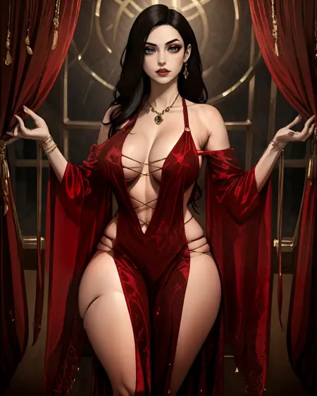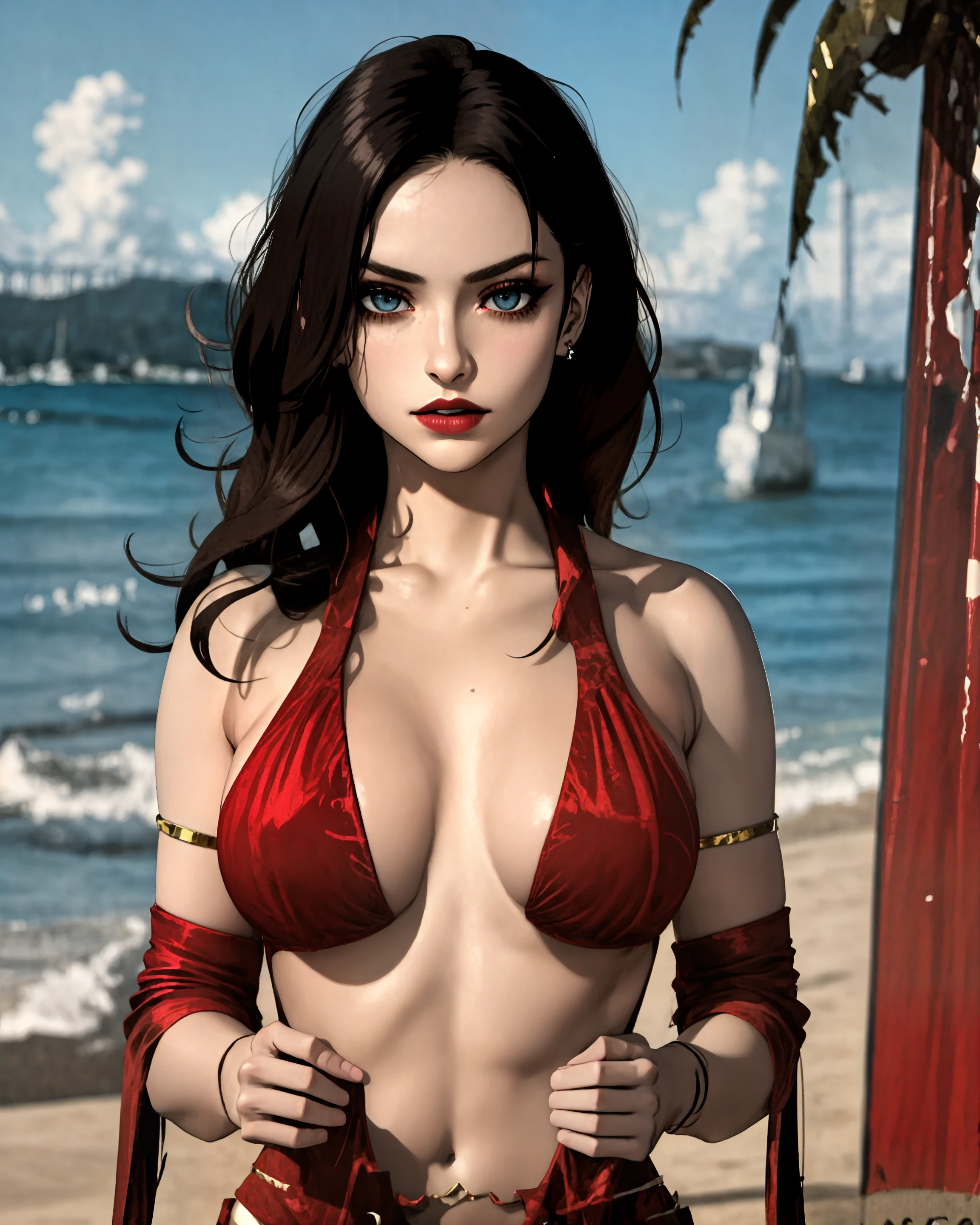 Appearance: 1girl, black hair, long hair, blue eyes, makeup, red eyeshadow, lipstick