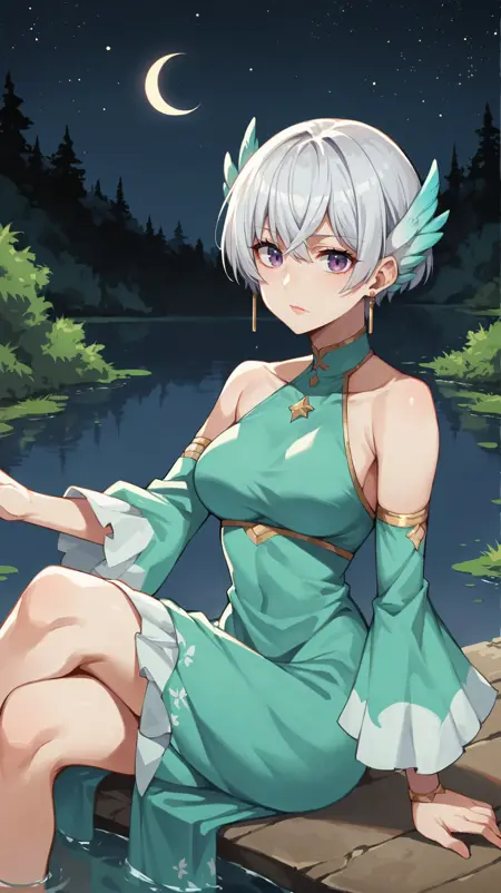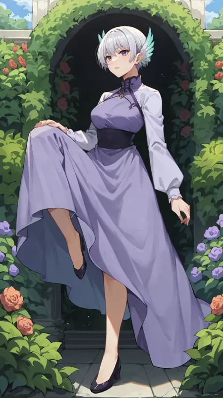 short hair, white hair, purple eyes, head wings, teal dress, halterneck, long dress