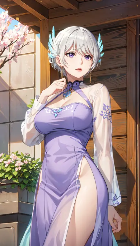 short hair, white hair, purple eyes, head wings, teal dress, halterneck, long dress